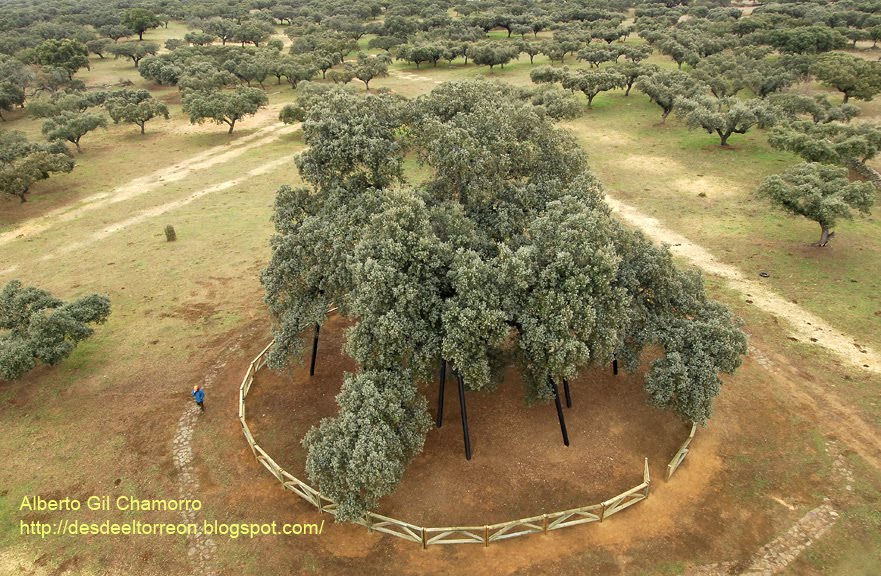 Esta superioridad tiene su base en la portentosa capacidad física de este ejemplar, que pese a los achaques propios de su avanzada edad (podríamos decir, utilizando un símil, que tiene osteoporosis), muestra una respuesta fisiológica propia de encinas maduras en su máximo esplendor. He pasado horas sentado frente a ella pensando en los avatares que habrá tenido que superar. Pensemos que cuando brotó la bellota que daría lugar a nuestra protagonista en el cercano castillo de Montánchez gobernaban los almohades, que el “bestseller” de su juventud era el Amadis de Gaula y que su máximo esplendor lo debió alcanzar antes de que Darwin publicara El Origen de las Especies. Imaginemos todas las situaciones de riesgo a las que ha estado expuesta desde que era una plántula de unos 5 cm de altura hasta que ha llegado al coloso actual de 17 m de altura, 30 m de diámetro de copa y casi 8 m de perímetro de tronco.