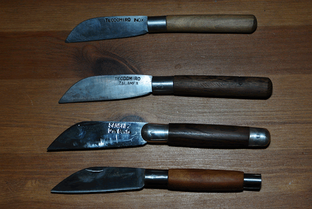 Arriba dos navajas de injertar de Vicente Sánchez de Don Benito, con acero al carbón y bubinga arriba y acero inox y encina abajo. Debajo de ellas navaja taponera o mocha de Flores Cortés de Don Benito con acero inox y bubinga.