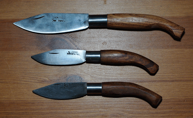 Navajas barrigudas o de lengua de vaca. De arriba a abajo: Vicente Sánchez, El Zorro y Flores Cortés. Las tres de Don Benito con acero al carbón las dos primera e inox la tercera y bubinga.