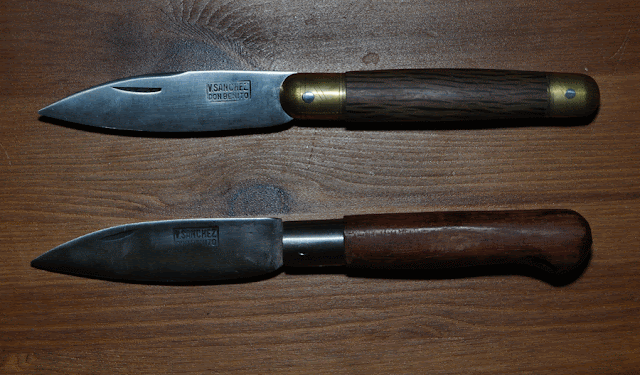 Navajas cabriteras de Vicente Sánchez de Don Benito. Ambas de acero al carbón, con encina y alpaca arriba y con bubinga y latón abajo.